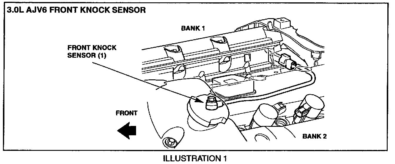 It is important to note that the V6 knock sensors are numbered as front and rear - not based on the engine banks. The front knock sensor (1) is located in the vee at the top of the engine where it senses knocking from bank 2, the left bank (Illustration 1).