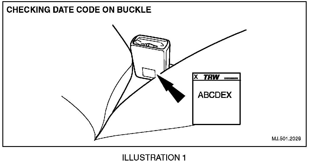 On vehicles equipped with a soft plastic cover protecting the front safety belt buckle assembly it is possible to check the date stamp (see table) without removing the seat. Follow the workshop procedure below for vehicles equipped with this type of front safety belt buckle assembly