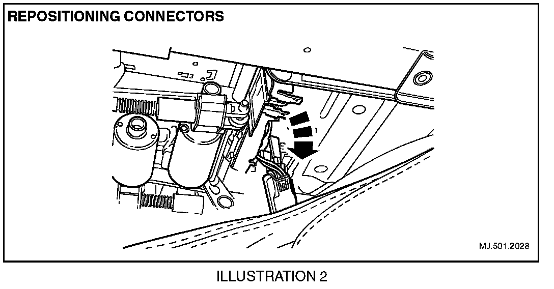 9. Remove the seat harness connectors from their seat frame mounting tangs (Illustration 2). Do not unplug the connector.