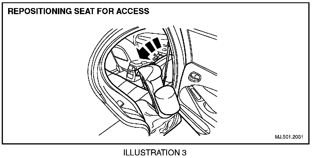 11. Carefully reposition front seat on its side for access to the safety belt buckle. During this operation, the seat back protrudes through the rear door opening. (Illustration 3).