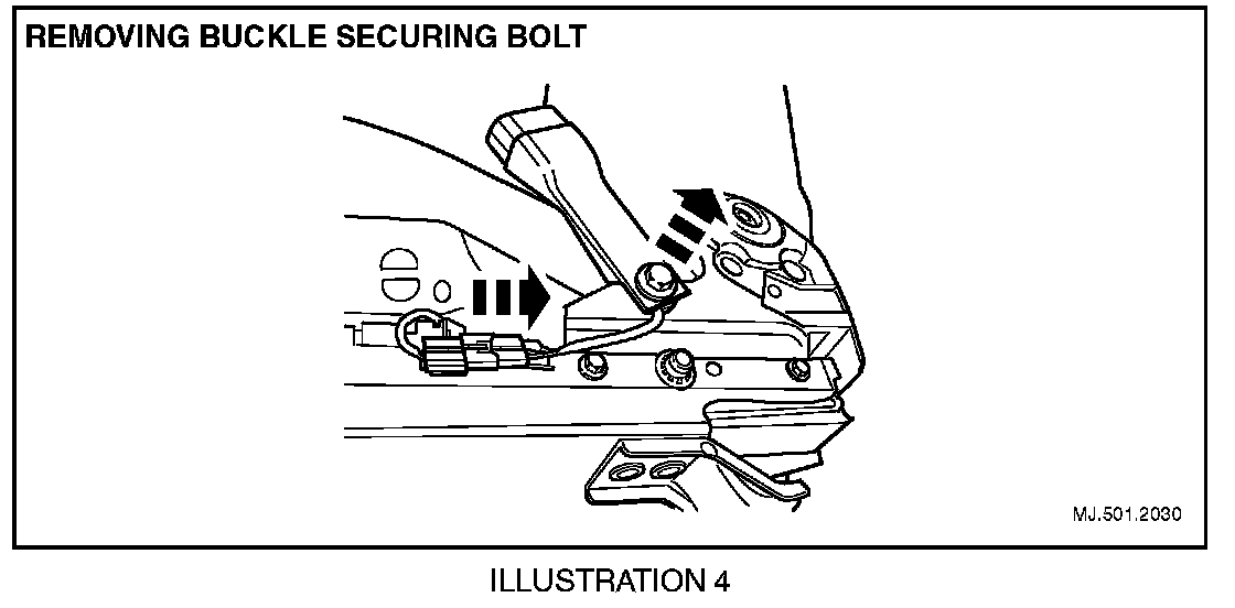 12. Disconnect the front safety belt buckle assembly connector. Loosen and remove the bolt securing the front safety belt buckle. Remove the safety belt buckle assembly and place to one side. (Illustration 4).