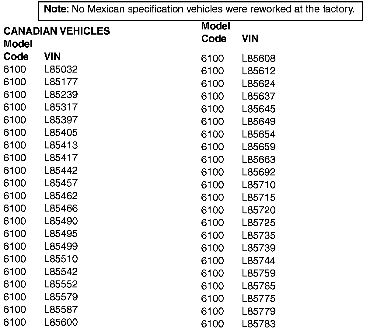 A number of vehicles have been reworked at the factory before being shipped. The vehicles that have been reworked are shown in this bulletin and do not require any further action.