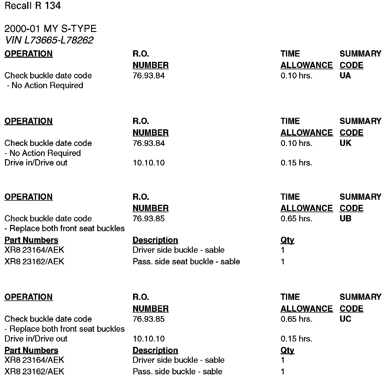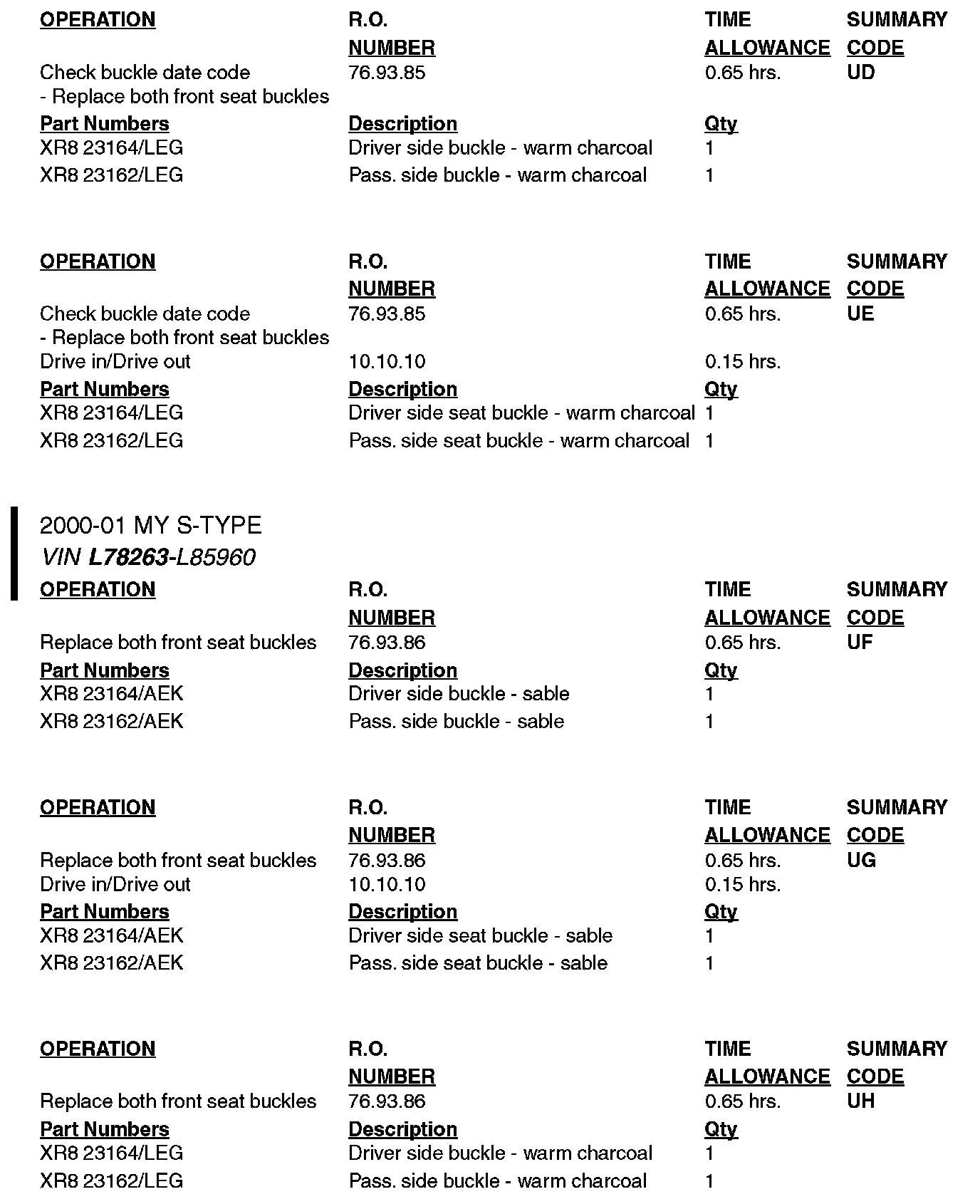 Jaguar has decided to recall affected vehicles to check and replace, where necessary, the front safety belt buckle assemblies on all S-Type vehicles produced in the above VIN range.