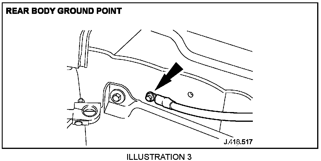 2.1 Check battery lead to rear body ground point fixing bolt, as shown in Illustration 3. (Torque tighten to 12 Nm +/- 1.8 Nm).