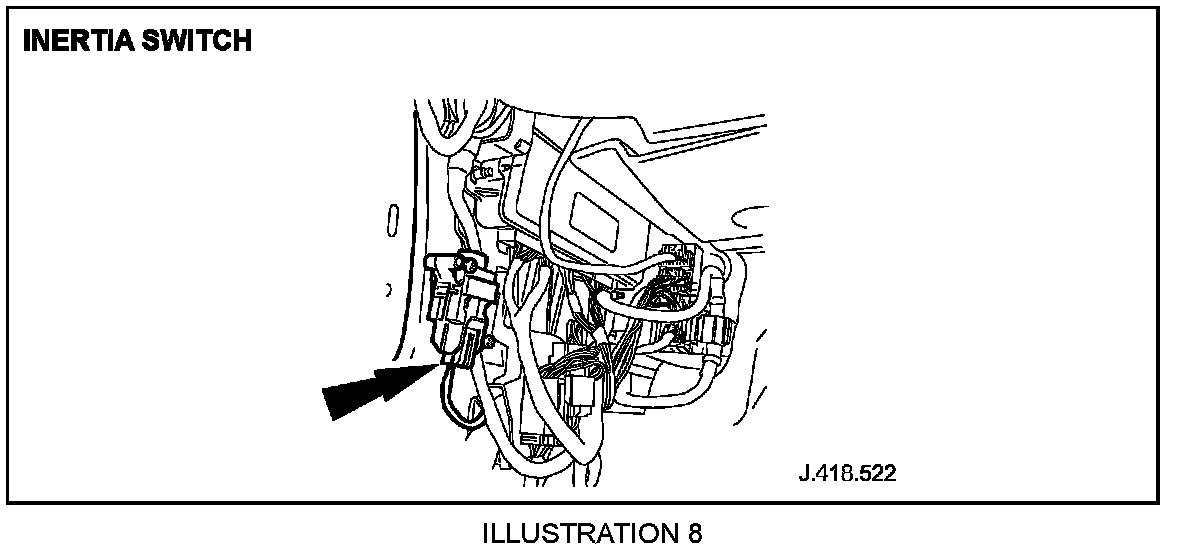 3.2 Check inertia switch connections are pushed fully home and are not damaged i.e. bent/backed-out. Where available, utilize opposing pins from the harness repair kit and insert into populated pins to ensure a good/tight fit is achieved (Illustration 8). On vehicles prior to VIN L63474 check that the harness is not pulled tight, putting strain on the inertia switch connector.