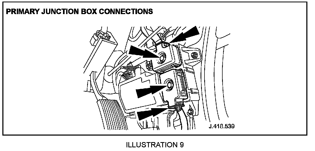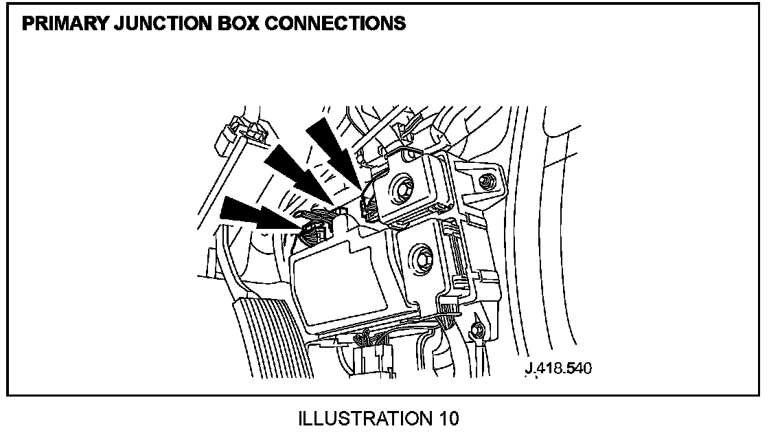 3.4 Check primary junction box connections (located in right-hand side A-post fuse box), as shown in Illustration 9. (Torque tighten to 3.2 Nm +/- 0.5 Nm) Wiggle block connectors to ensure they are sufficiently clamped to fuse box i.e. tight.