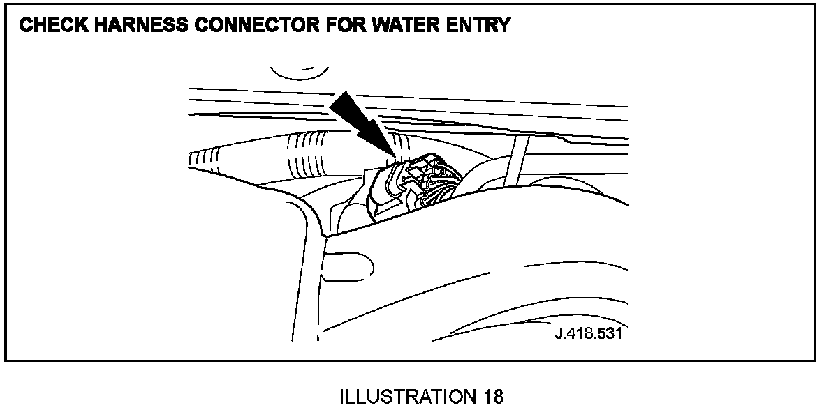 4.6 Check in-line connector from engine harness to injector harness for signs of water ingress (Illustration 18). Ensure the connectors are pushed fully home and are not damaged i.e. bent/backed-out. Where available, utilize opposing pins from the harness repair kit and insert into populated pins to ensure a good/tight fit is achieved.