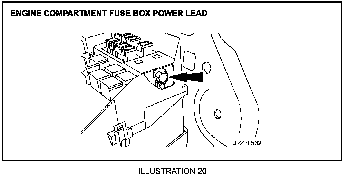 4.8 Check the engine compartment fuse box power lead, as shown in Illustration 20. (Torque tighten to 12 Nm +/- 1.8 Nm).