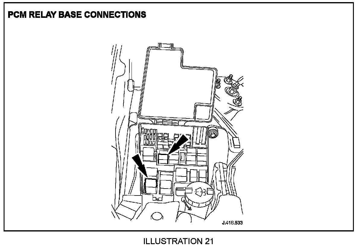 4.9 Check the PCM relay base connections (relays number 4 and 14 in engine compartment fuse box) are pushed fully home and are not damaged i.e. bent/backed-out. Where available, utilize opposing pins from the harness repair kit and insert into populated pins to ensure a good/tight fit is achieved (Illustration 21).