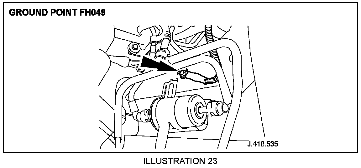 5.1 Check ground point FH049 (located under front passenger side wheel arch liner), as shown in Illustration 23. (Torque tighten to 12 Nm +/- 1.8 Nm).