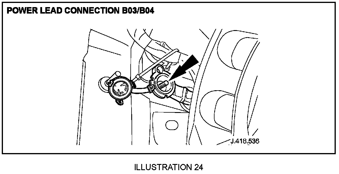 5.2 Check power lead connection B03/B04 (located under front right-hand wheel arch liner), as shown in Illustration 24 (Torque tighten to 12 Nm +/- 1.8 Nm).