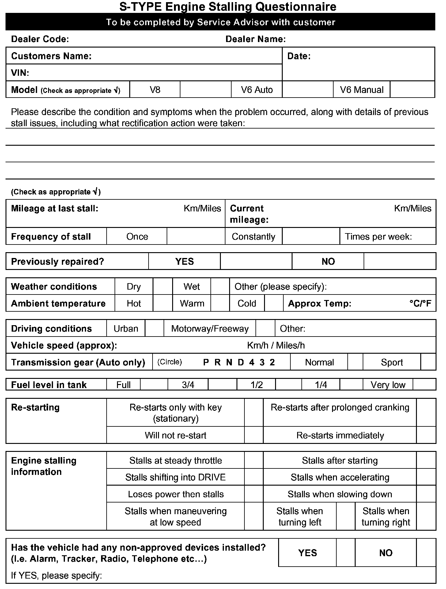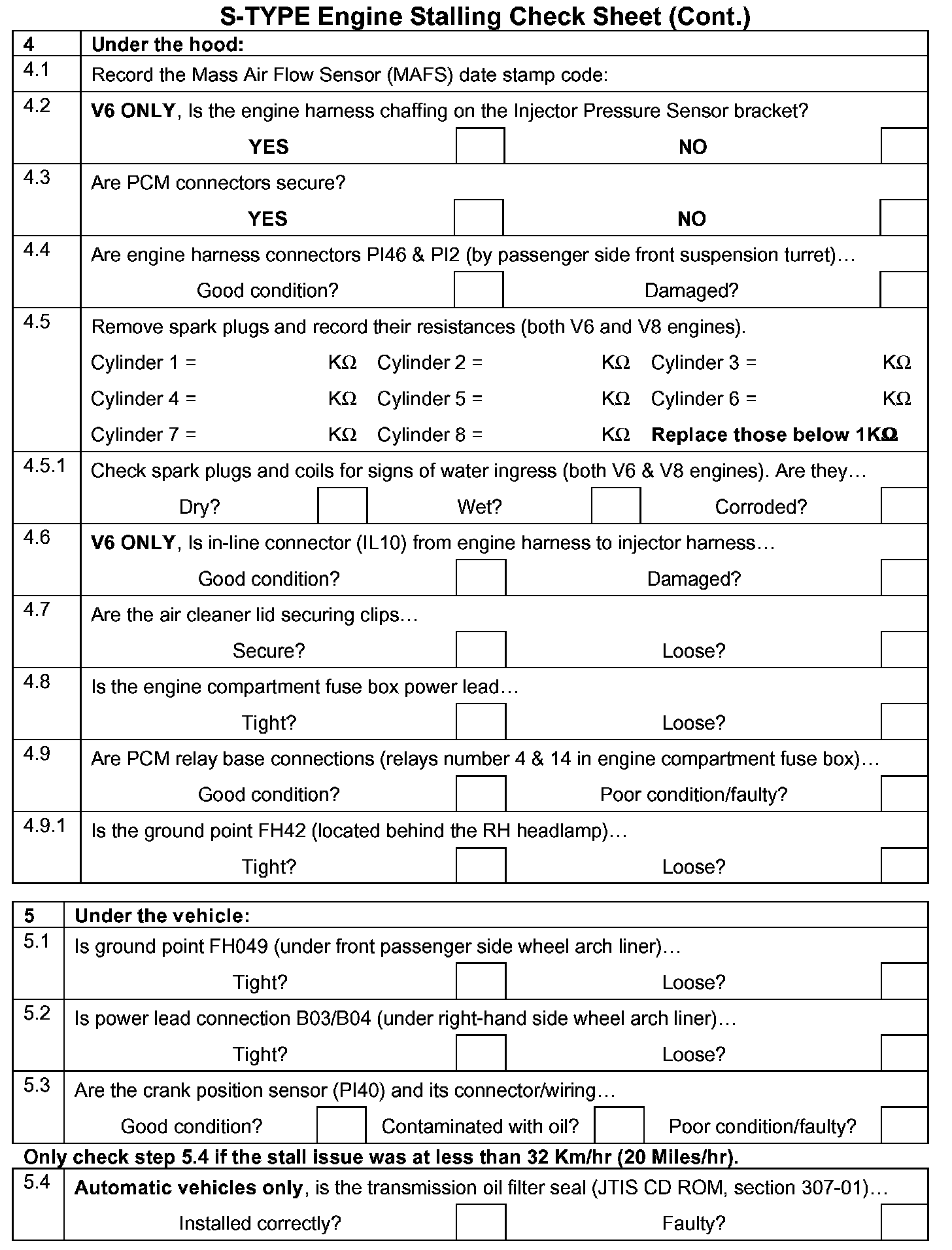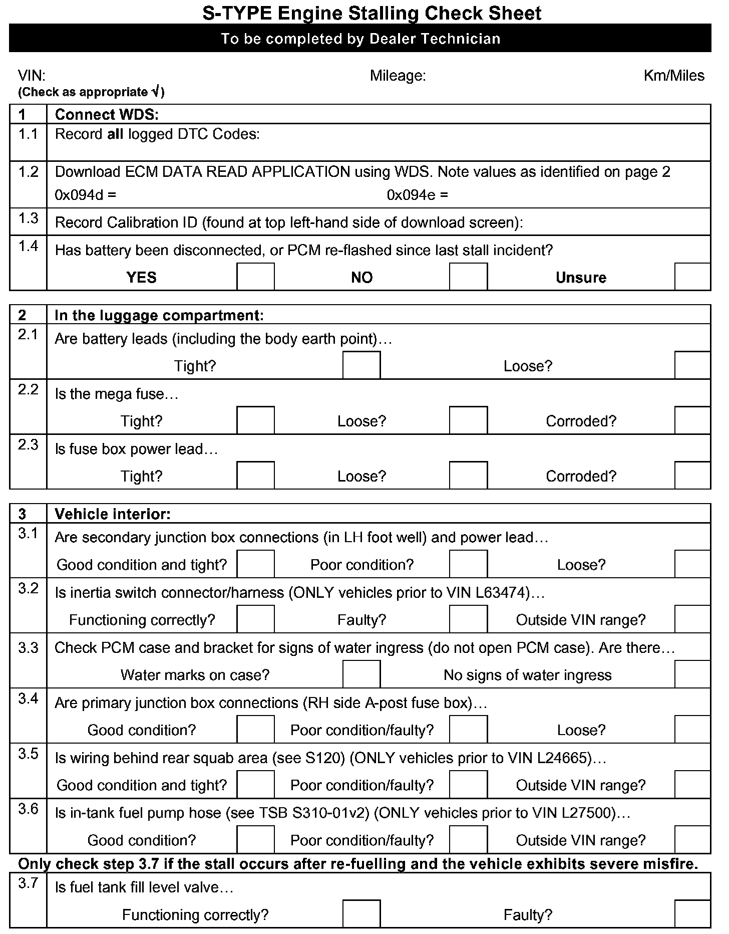 Some owners of 2000-*02* MY S-TYPE vehicles, *within the above VIN range*, may experience driveablity issues including stalling. Check sheets are shown followed with diagnostic information for all S-TYPE vehicles with driveablity issues including stalling.