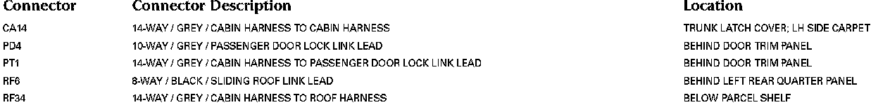 For detailed informations and illustrations regarding the location and identification of control modules pins, refer to Vehicle / Diagrams / Connector Views. Connector Views