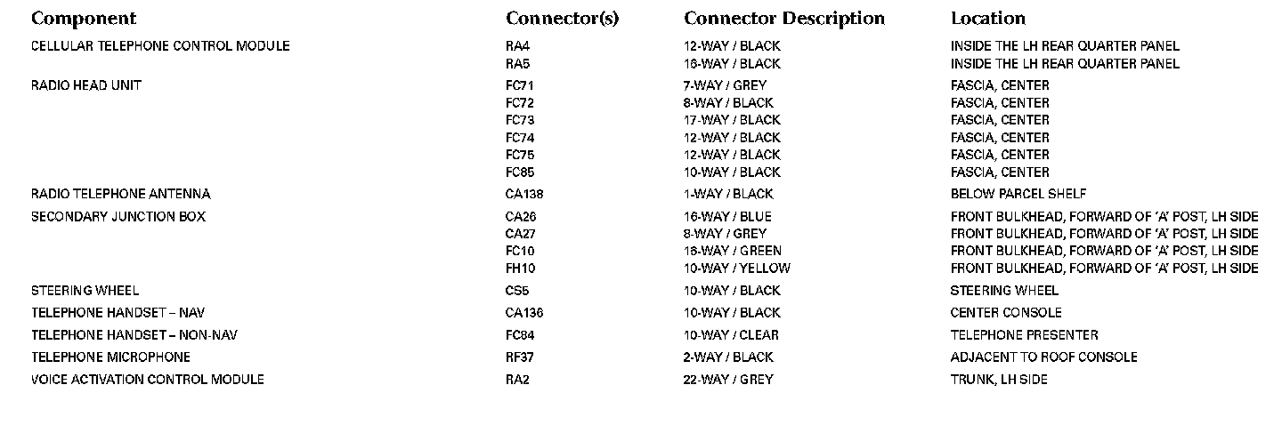 Refer to Vehicle / Locations for detailed information and illustrations regarding the location and identification of harnesses, relays, grounds and control modules. Locations