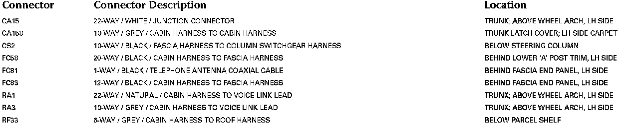 For detailed informations and illustrations regarding the location and identification of control modules pins, refer to Vehicle / Diagrams / Connector Views. Connector Views