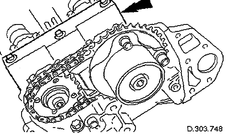 - Rotate the crankshaft until the triangular arrow indent on the drive plate is visible through the access hole; confirm that the timing flat on each camshaft is uppermost.