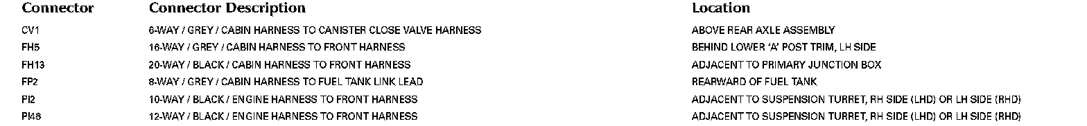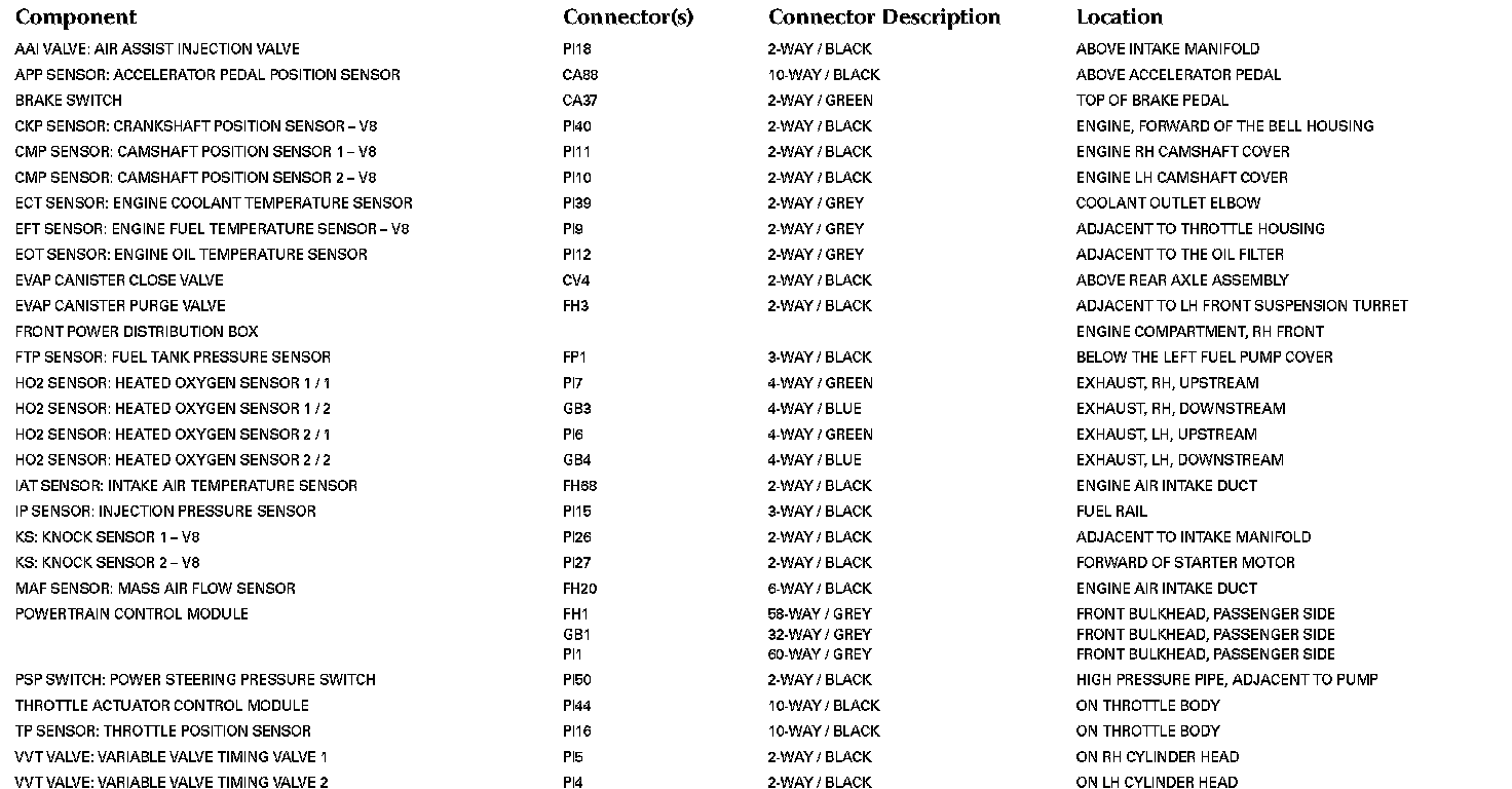 Refer to Vehicle / Locations for detailed information and illustrations regarding the location and identification of harnesses, relays, grounds and control modules. Locations
