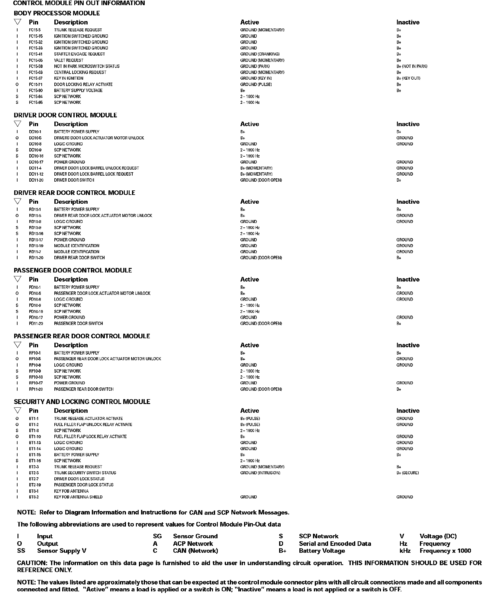 Control Module Pin Out Information: