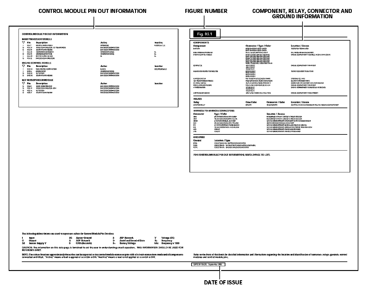 Where circuits include a Control Module, Pin Out information is provided with values for "active" and "inactive" states. The values listed are approximately those that can be expected at the control module connector pins with all circuit connections made and all components connected and fitted. "Active" means a load is applied or a switch is ON; "inactive" means a load is not applied or a switch is OFF. This information is provided to assist the user in understanding circuit operation and should be used FOR REFERENCE ONLY.