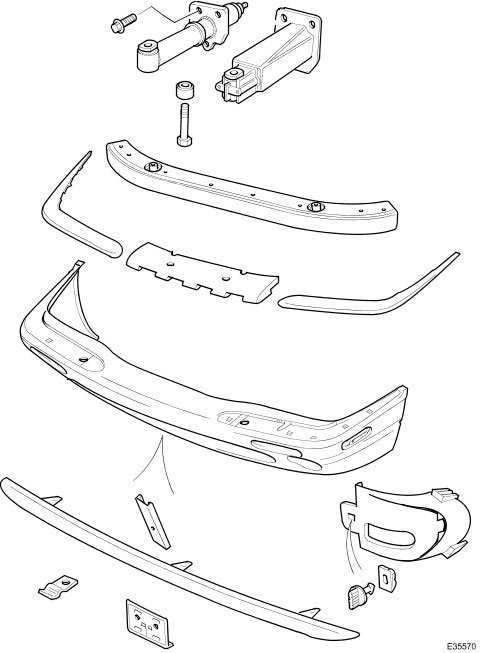 Each bumper comprises a beam mounted to the body via two strut assemblies, and a moulded polypropylene cover incorporating side armatures and chrome plated blades. Each bumper strut is secured to the BIW by three bolts and supports the beam on a single bolt/height adjuster. The front bumper cover which is moulded to form a lower air intake for the cooling pack, also incorporates left and right handed twin fog lamps, brake cooling ducts. Side marker lamps fitted for some markets serve only as reflectors for UK and Europe. A plastic undertray secured to the lower edge of the front bumper, improves airflow and minimises the ingress of road grime in that area. Standard bumpers have glass mat thermoplastic (GMT) beams mounted on GMT struts. For certain markets, aluminium bumper beams are installed on menasco energy absorbing struts. Whilst both types of front bumper provide a fully integrated 'soft front end' that satisfies bumper impact requirements, the energy absorbing front and rear bumpers are further designed to withstand 5mph (8kph) impacts with no visible damage sustained. Side markers/reflectors, and direction indicators are designed for ease of access from the outside of the bumper. For adjustment and bulb change, the fog lamps are accessed from the bumper interior. The bumper covers are body coloured and matched. Replacement covers are supplied complete with side armatures and are finished in primer.