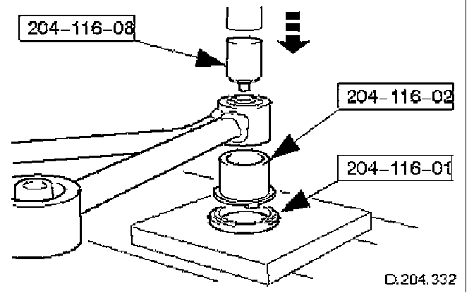 ^ Position special tool on top of bush and align tool with press ram.
