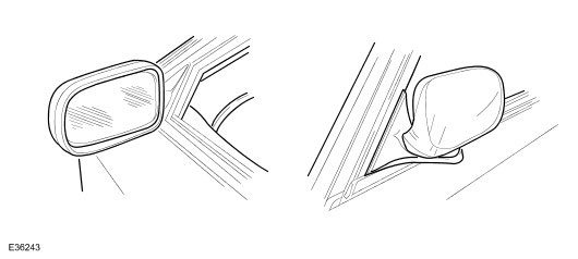 The door mirrors are cheater mounted, color-keyed units, remote electrically adjustable and heated. Adjustment of both mirrors is carried out from the driver's door switch pack. A slider switch selects the mirror to be adjusted, and a disc switch adjusts the selected mirror to the required position.