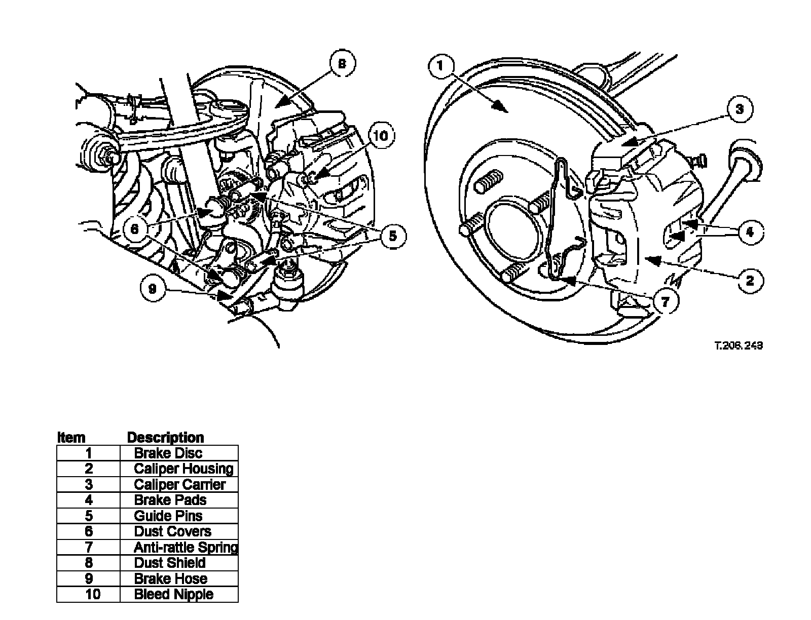 The caliper carrier, which is secured to the vertical link by two bolts, carries the single-piston caliper housing. The caliper housing is secured to the caliper carrier by two guide-pins and an anti-rattle spring. When the brakes are applied the caliper-housing piston pushes the brake pad in front of it, towards the brake disc. This movement forces the caliper housing to move along the guide-pins, in the opposite direction of the piston, to apply the second brake pad. The brake disc is therefore gripped between the two pads. As brake pressure is increased the grip on the brake disc is increased to slow-down the rotation of the road wheel.
