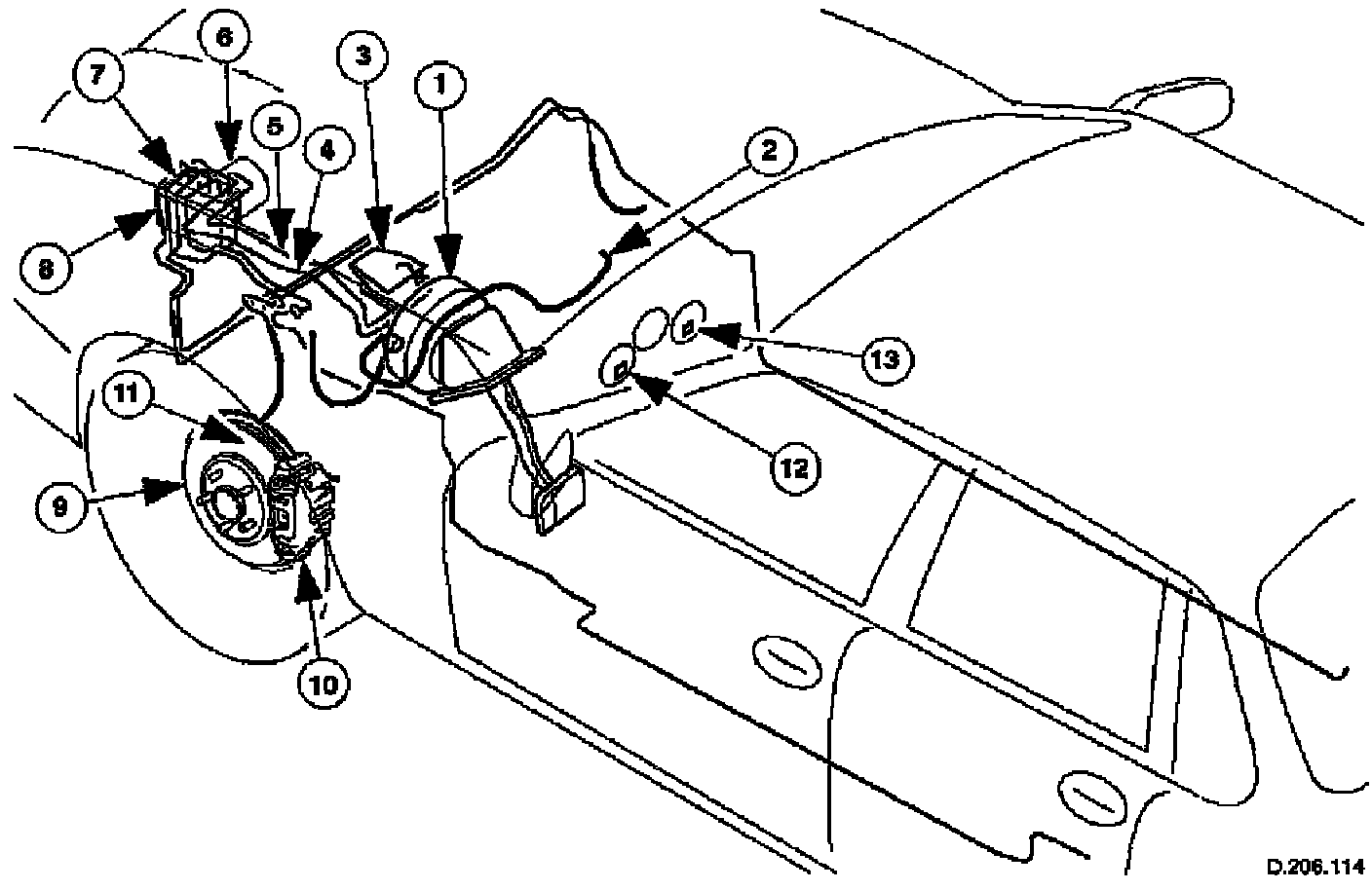 The brake calipers are of the single piston type. The caliper carrier, which is secured to the vertical link by two bolts, carries the single-piston caliper housing. The caliper housing is secured to the caliper carrier by two guide-pins and an anti-rattle spring. When the brakes are applied, the caliper-housing piston pushes the brake pad in front of it, towards the brake disc. This movement forces the caliper housing to move along the guide-pins, in the opposite direction of the piston, to apply the second brake pad.