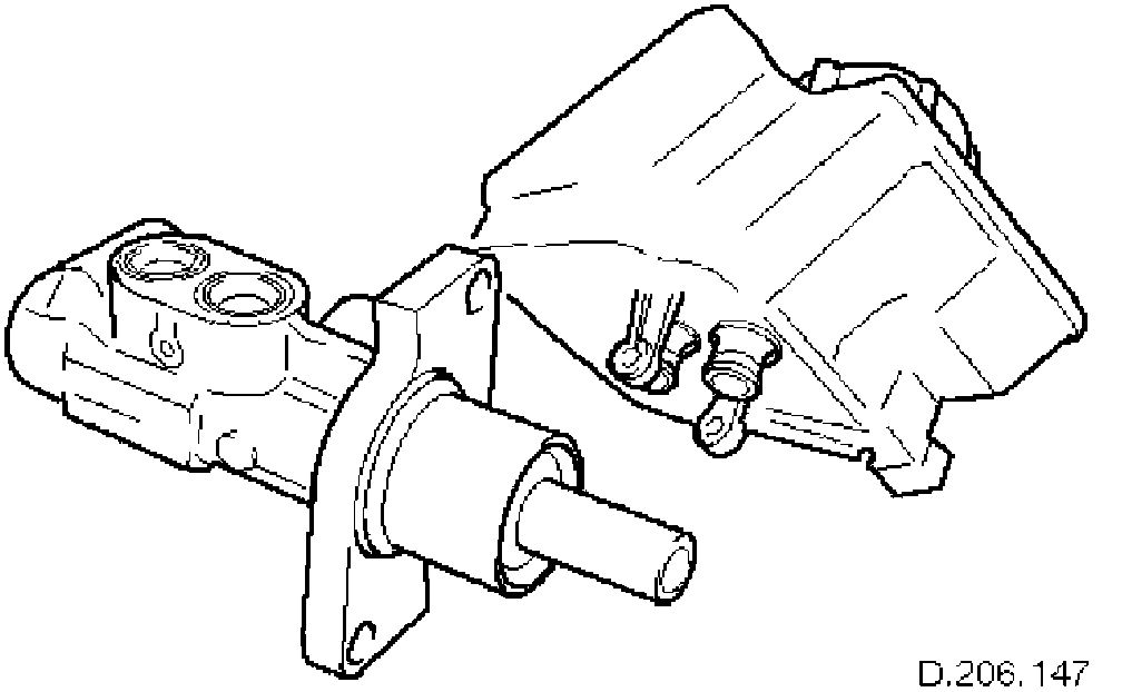 The tandem master cylinder contains two independent pistons, fluid pressure to each brake circuit is controlled by its own individual piston. Brake fluid is supplied to the master cylinder by the reservoir, which is divided into two sections to prevent total fluid loss should one of the circuits fail. A port situated at the bottom of each section of the reservoir supplies the fluid to each piston.