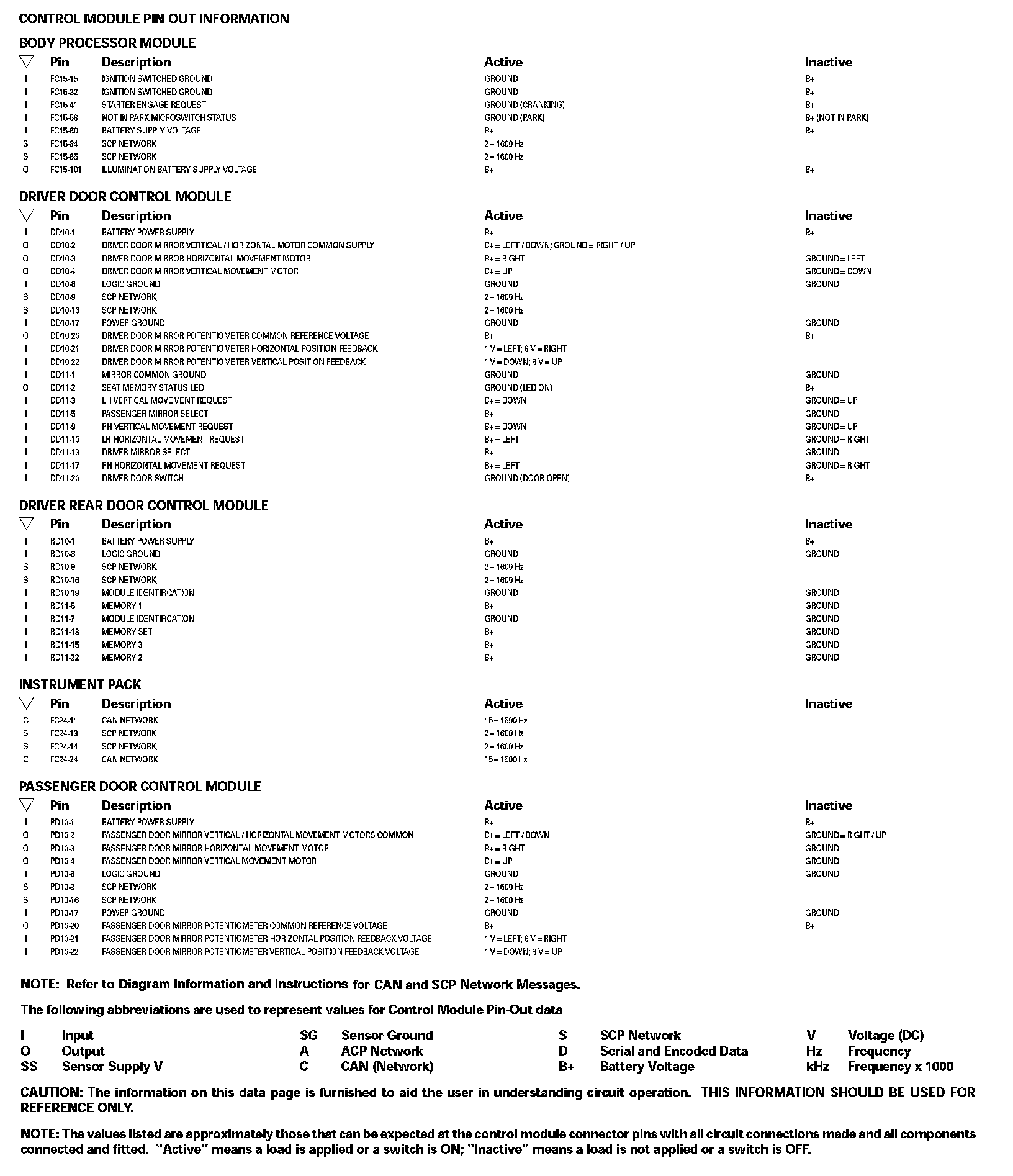Control Module Pin Out Information: