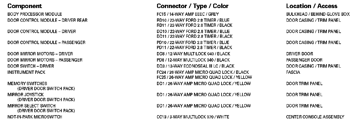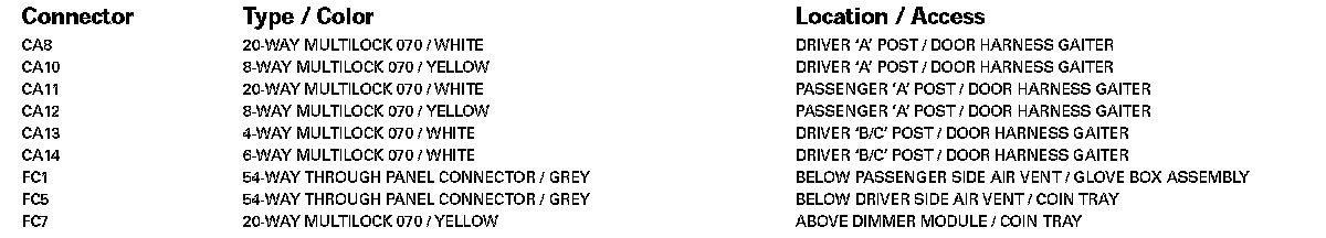 For detailed informations and illustrations regarding the location and identification of control modules pins, refer to Vehicle / Diagrams / Connector Views. Connector Views