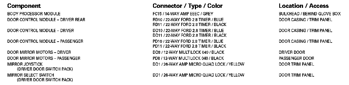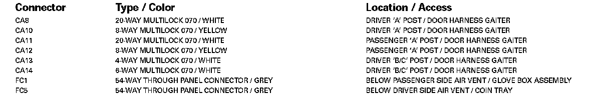 For detailed informations and illustrations regarding the location and identification of control modules pins, refer to Vehicle / Diagrams / Connector Views. Connector Views