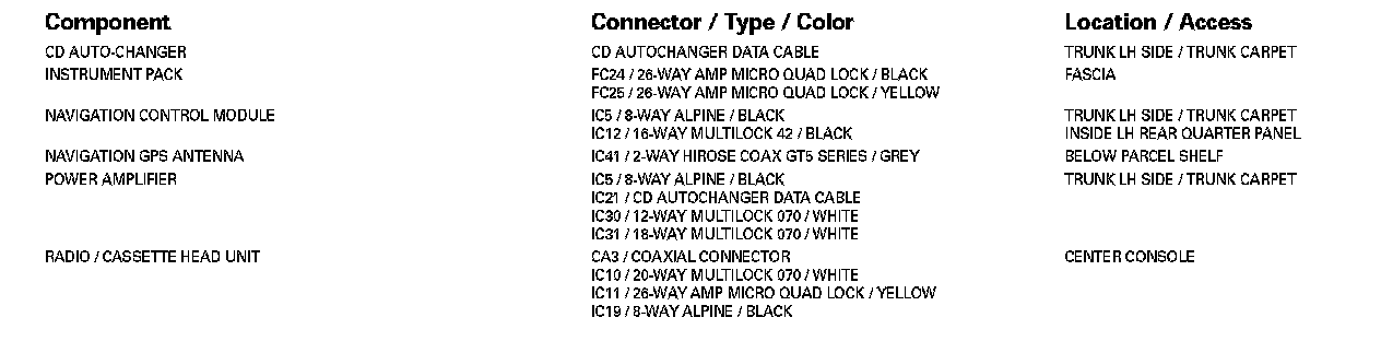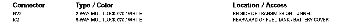 Refer to Vehicle / Locations for detailed information and illustrations regarding the location and identification of harnesses, relays, grounds and control modules. Locations