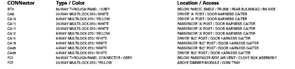 For detailed informations and illustrations regarding the location and identification of control modules pins, refer to Vehicle / Diagrams / Connector Views. Connector Views