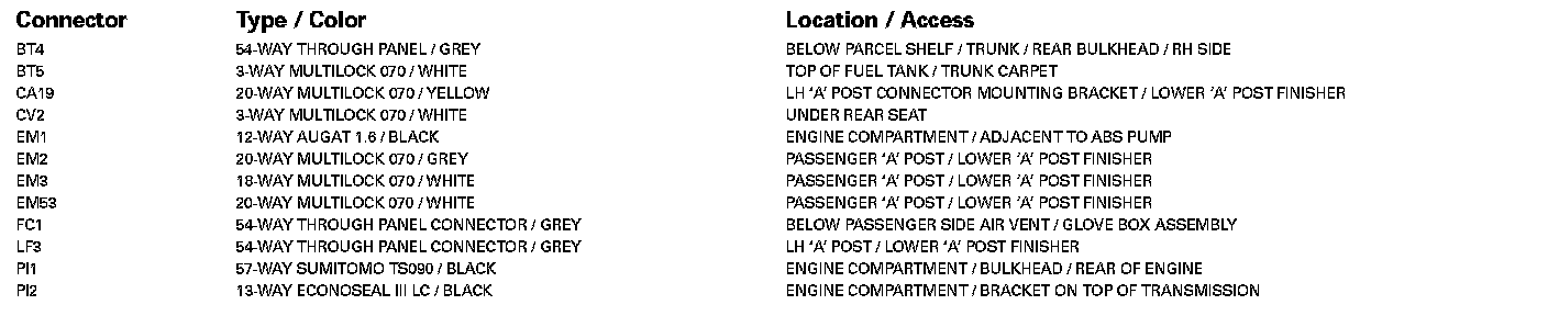 For detailed informations and illustrations regarding the location and identification of control modules pins, refer to Vehicle / Diagrams / Connector Views. Connector Views