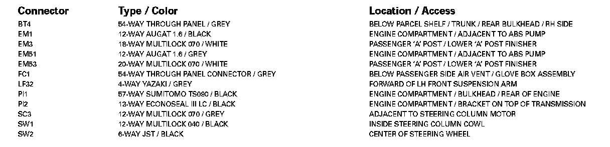 For detailed informations and illustrations regarding the location and identification of control modules pins, refer to Vehicle / Diagrams / Connector Views. Connector Views