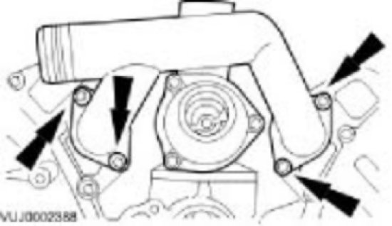 Install the outlet pipe to the bypass hose and to the cylinder heads.