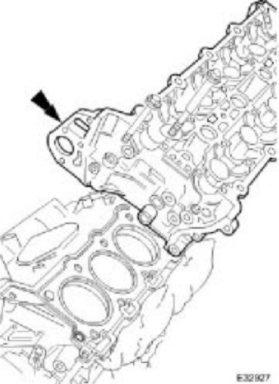 Engage the cylinder head with the dowels on the block face, and the exhaust manifold flange with the studs on the downpipe catalyst.