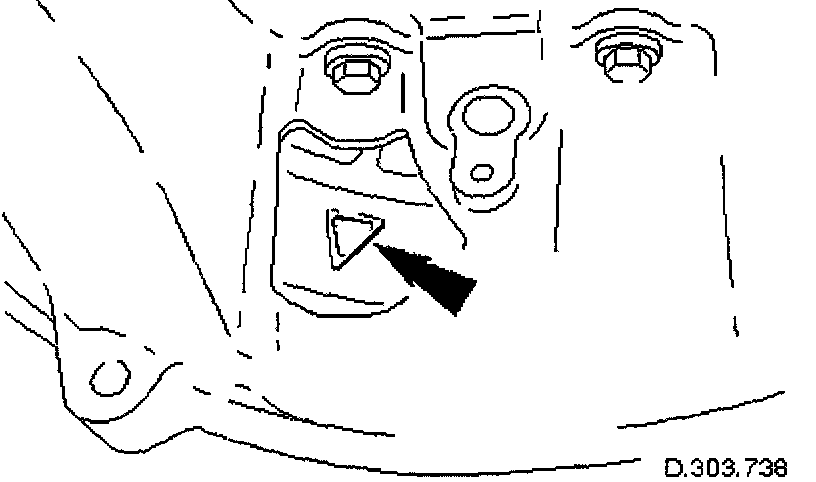 6. Rotate the crankshaft until the triangular arrow indent on the drive plate is visible through the access hole; confirm that the timing flat on each camshaft is uppermost.