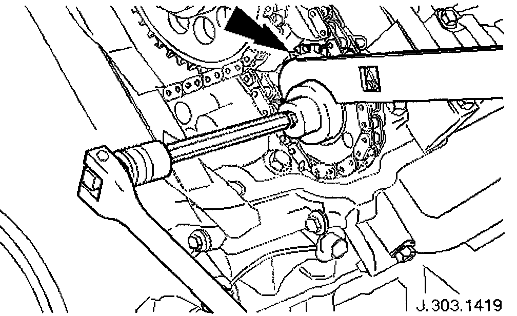 Adjust the position of the sprocket within the chain to allow the chain tensioning tool 303-532 to be approximately vertical, as shown.