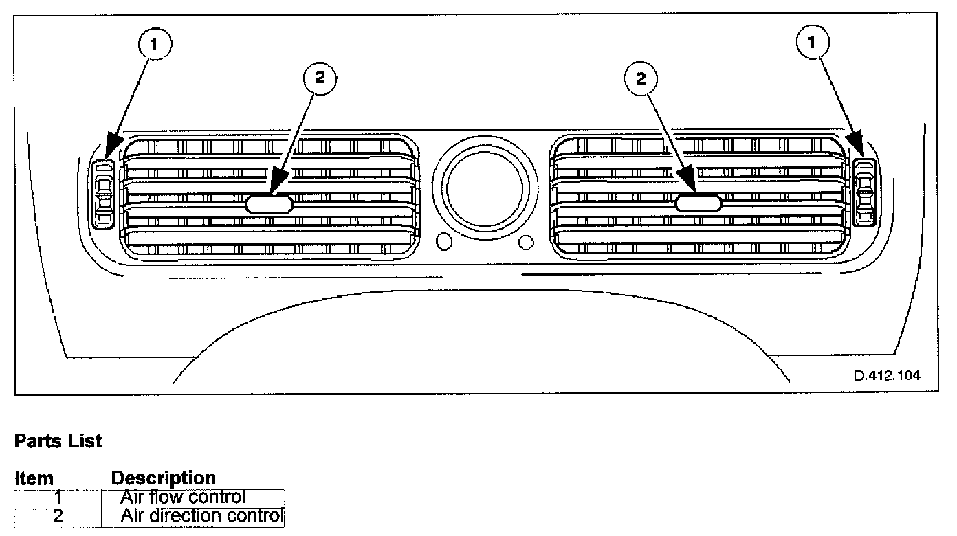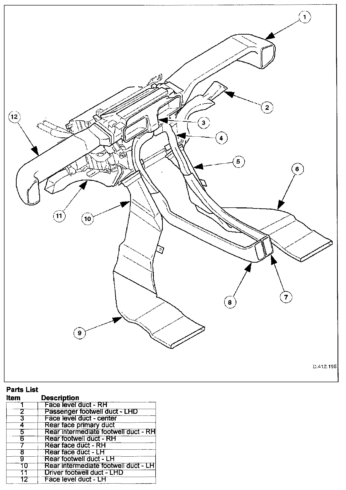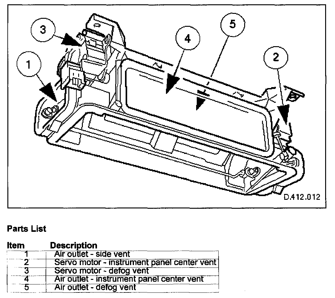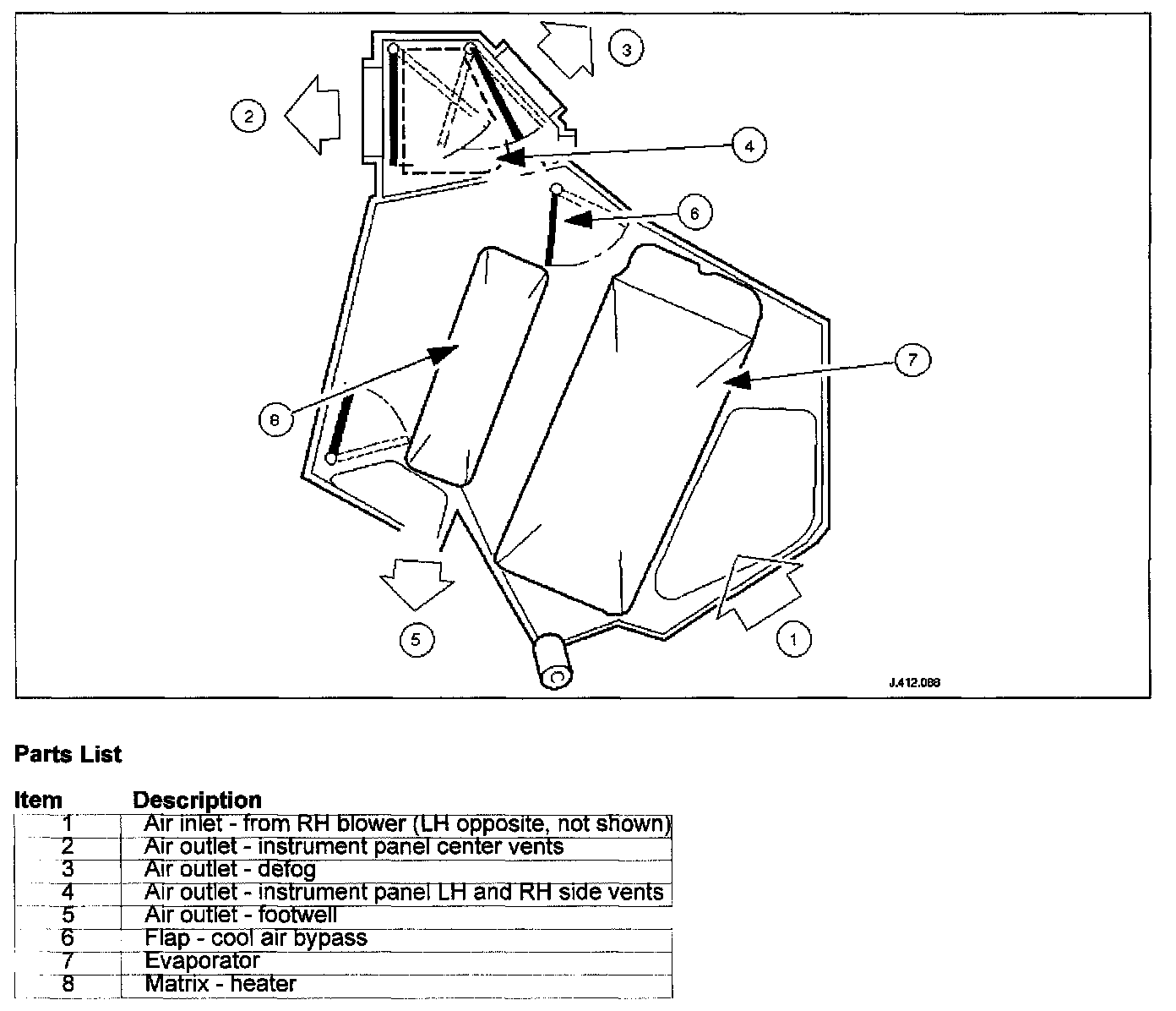 The upper air distribution box ADB, is fixed to the defog duct and instrument panel assembly, and seals by contact pressure to the outlet (top) of the air conditioning unit. The ADB incorporates two servo motor operated flaps which regulate airflow to: