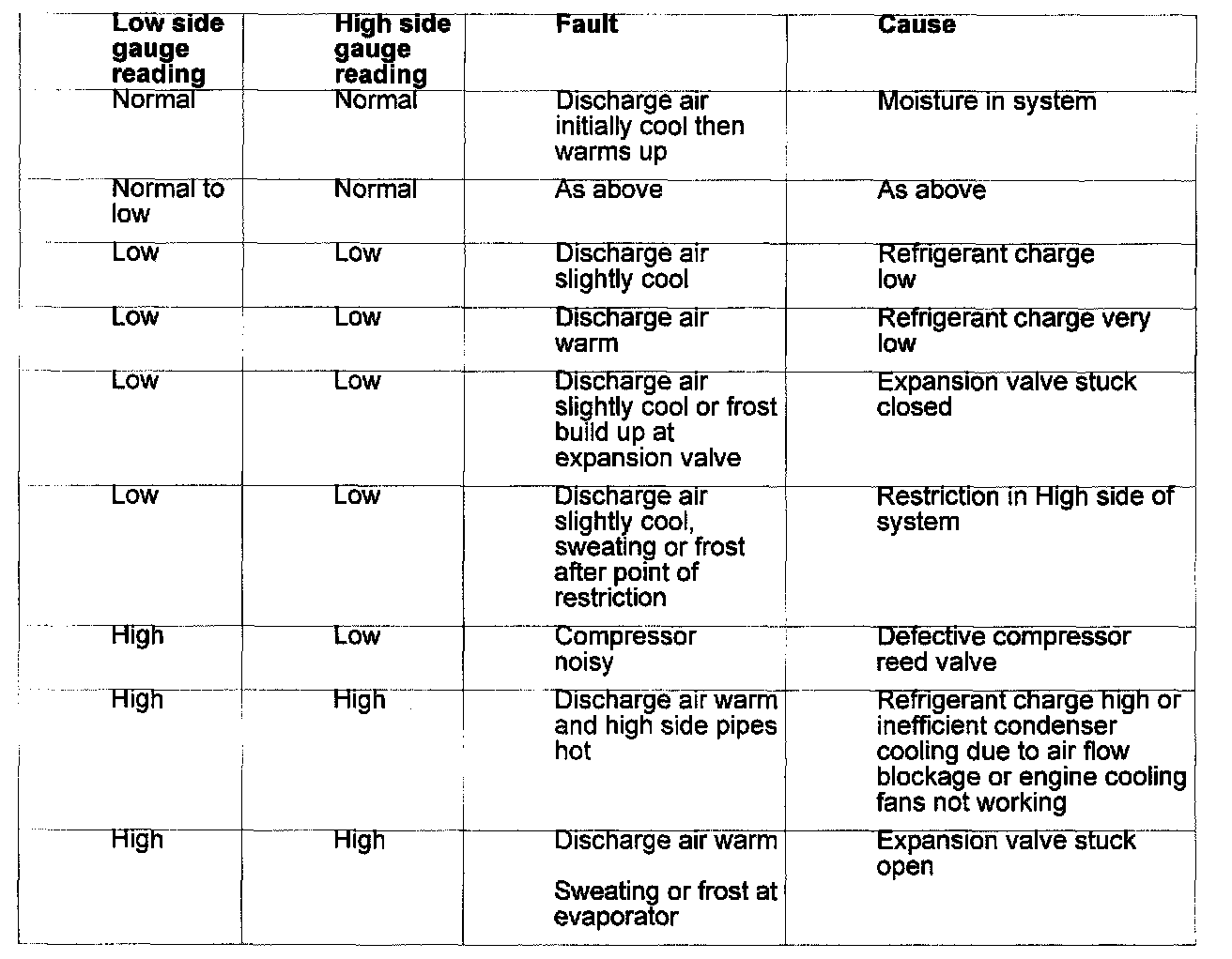 Probable causes of faults may be found by comparing actual system pressures, registered on your manifold gauge set or recovery/recharge/recycle station, and the relevant pressure to temperature relationship graph. The following chart shows the interpretation that may be made by this difference.