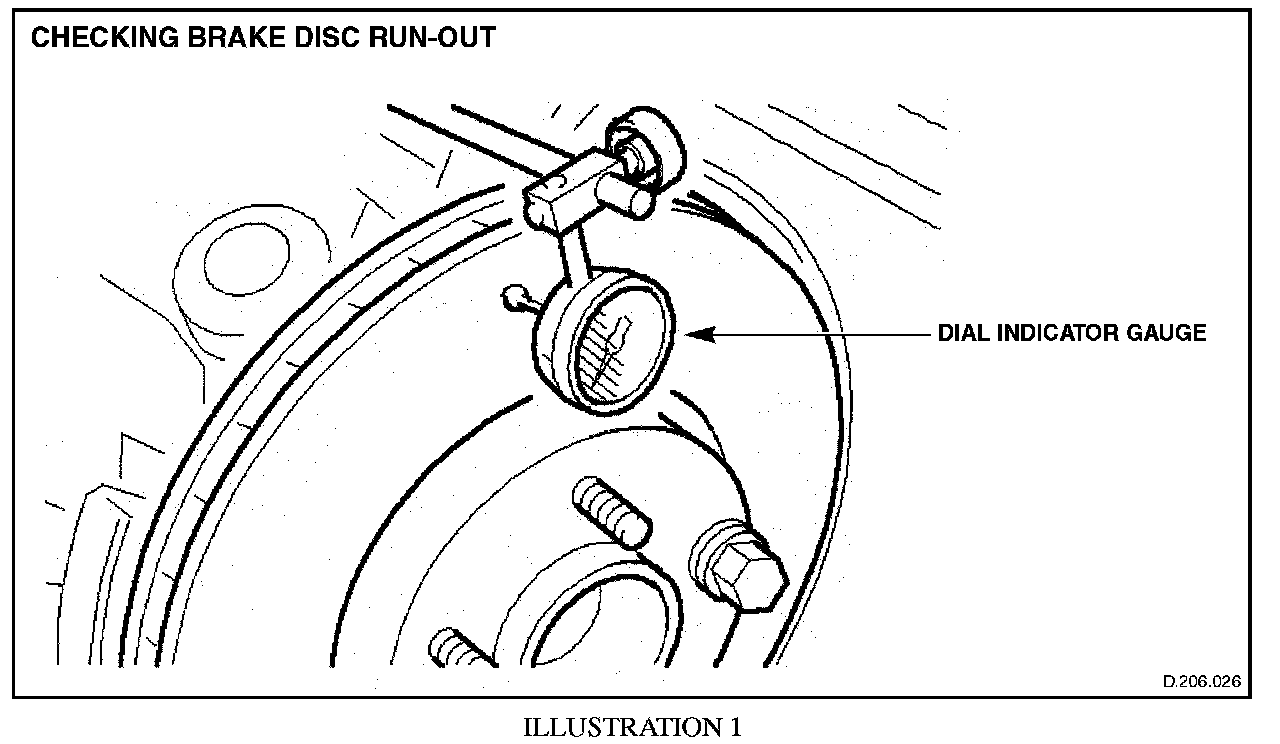 4. Use the dial indicator gauge to check for disc run-out (illustration 1). If excessive run-out is present recheck the condition of the mating faces.
