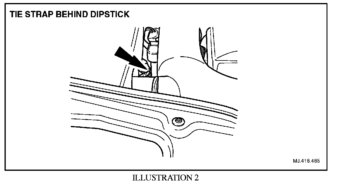 3. The tie strap (if fitted) locates around the camshaft sensor harness behind the oil dipstick (Illustration 2).