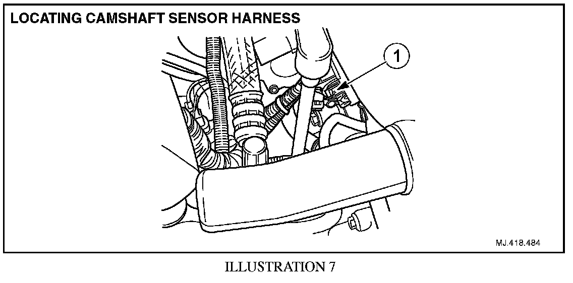 The camshaft harness connector is shown as item 1 (Illustration 7).