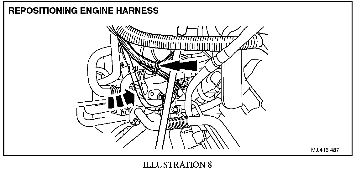 6. Reposition the engine harness lower branch lead to the upper branch lead and using the tie strap, secure the branch leads together (Illustration 8).