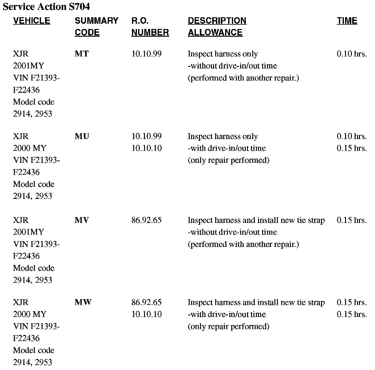Warranty summary codes have been assigned to this service action in order to simplify claim submission. The dealership will be reimbursed for parts and labor time allowance as indicated.