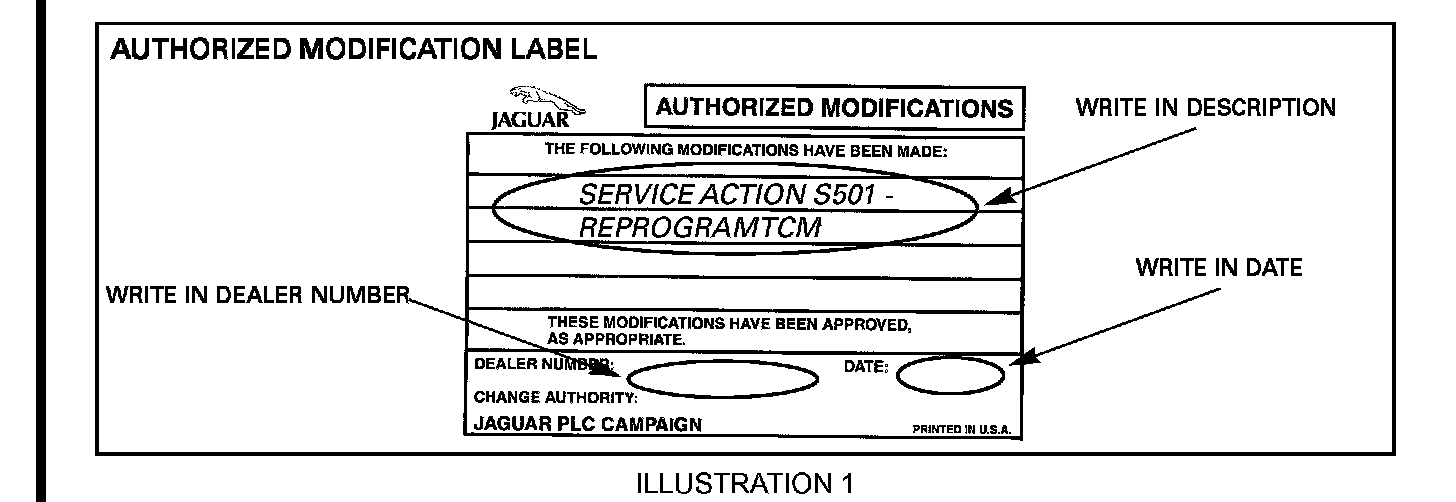 *Fill out an authorized modification label (Illustration 1), enter the dealer number and date on the authorized modification label. List any other service actions that have been performed at the same time. Apply the label to the driver door on XKR vehicles (Illustration 2) or under the hood on V8 XJ Series vehicles (Illustration 3) and apply the clear sheet over the label.*