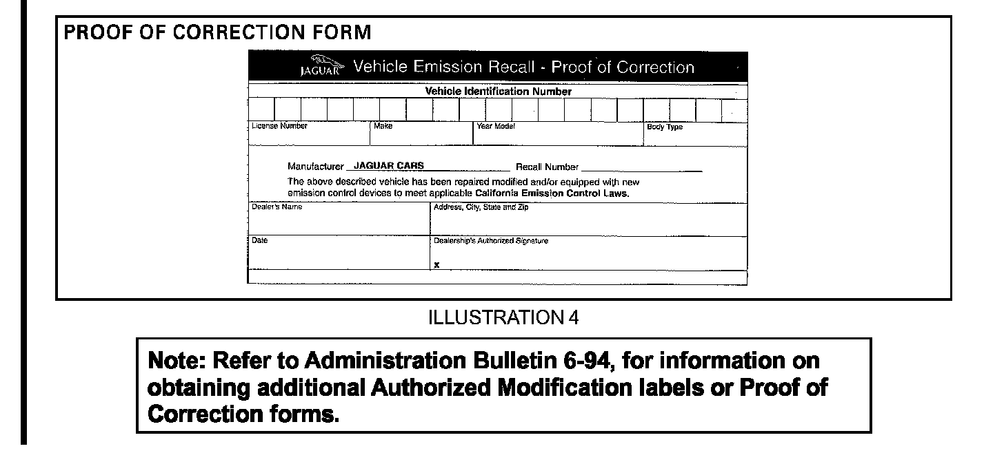 California Dealers (and any other states where required): Fill out and place the salmon colored "Vehicle Emission Recall - Proof of Correction" form (illustration 4, part no. S CAL RCL) in the vehicle glove compartment.