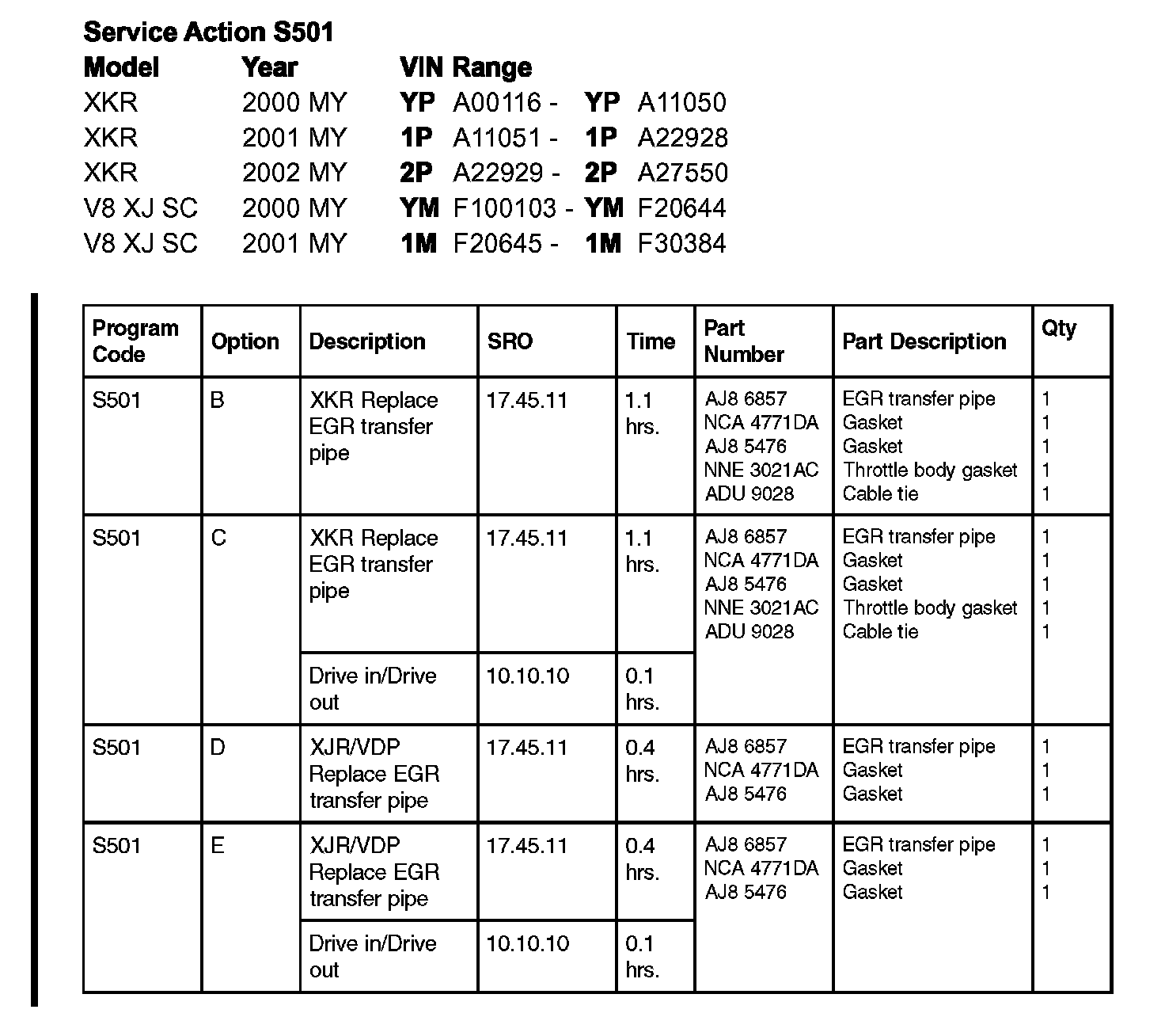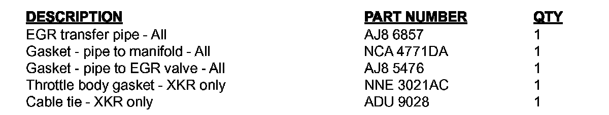At the next service opportunity, replace the EGR transfer pipe on all 2000-02 MY XKR and 2000-01 MY XJR & VDP SC vehicles within the above VIN range.